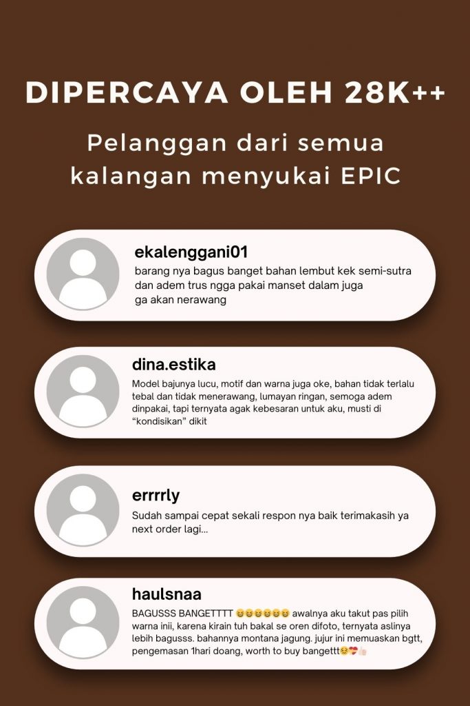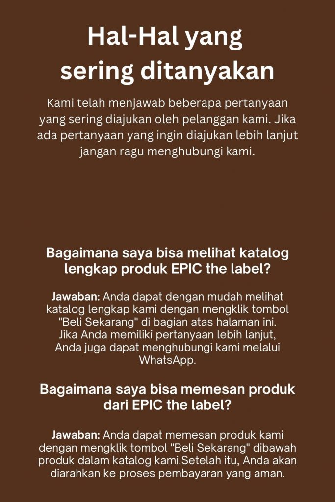 Kami mengucapkan terima kasih atas kunjungan anda ke EPIC the label. Kami berkomitmen untuk memberikan produk berkualitas dan pelayanan terbaik. Kami berharap Anda menemukan produk yang sempurna sesuai gaya Anda.